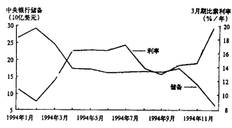 墨西哥的外汇储备和利率(1994年1-12月) 资料来源: Jeffrey Sachs,Aaron Tornel, and Andres Velasco,"The Collapse of the Mexican Peso:What Have We Learned?” Working Paper 5142,National Bureau of Economic Research,June 1995."