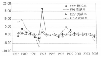 四 FDI对外汇储备增长的贡献率分析上文运用协整理论实证分析了FDI与外汇储备直接的短期及长期动态关系, 证实了FDI的确对外汇储备具有相当重大的影响。值得注意的是, 协整理论是设定时间序列为内生变量来进行分析的, 这在一定程度上揭示了FDI与外汇储备之间的内在相互影响。现实中国经济中, FDI更多的是受到外部因素的影响, 即中国引入外资的优惠政策, 逐步改善的投资环境, 日益增长的投资回报等。这就需要将FDI看作外生变量来分析其对外汇储备增长的贡献。通过上文设定的模型, 我们可以比较方便地计算出FDI、EXP、EXM等对外汇储备增长的贡献率, 如图 2所示。