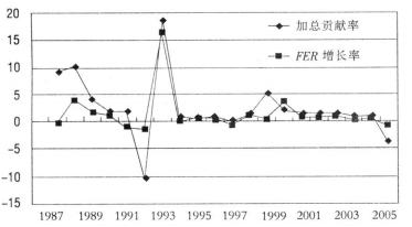 1994年之前外汇储备波动剧烈, 而1994年波幅最大, 这是由于1994年中国对外汇管理体制进行了重大改革, 因此导致外汇储备大幅增加。之后外汇储备波动较为平缓, 在1997年其数额有所下降, 这与当时的亚洲金融危机有关。而FDI对外汇储备的贡献率一直较为平稳, 除了少数几年(1993年达到最低, 为-5.21)外, FDI对外汇储备的影响一直保持在一个平稳状态。应该注意到的是, FDI对出口具有相当大的影响, 直接表现在FDI大多投向出口导向型企业。FDI的流入势必会增加工业制成品的出口, 从图 2中也可以看到工业制成品的出口与FDI的增长率变动趋势基本同向, 而初级产品出口贡献率的变化则一直比较平缓。图 3显示了FDI与工业制成品出口共同对外汇储备的加总贡献率。可以看到, 两者能够比较好地拟合外汇储备的增长率。这两者从很大程度上可以视为外生变量, 而一国进口、外债很大程度上受到本国GDP、利率的影响, 而一国的GDP和利率通过FDI与出口的变化表现出来了。