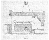 图 6 19世纪现代焚化炉的横截面图。这种焚化炉改良自钢制技术,使尸体在火化时不会碰到火焰。 |