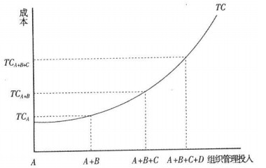 这时, 要确定跨国公司垂直关系形式, 除了一体化的经营成本以外, 还要考虑其收益状况以及与其他两种垂直关系形式的成本收益关系。类似地, 可以将垂直一体化程度的成本和收益定义为将更多垂直环节纳入公司内部后带来的成本和销售收入, 见图 1, 图中只画出了总成本曲线(TC), 这种情形说明随着越来越多的垂直环节纳入跨国公司内部, 总成本水平越来越高, 总成本曲线是递增的, 由于总成本曲线的斜率逐渐变大, 表明边际成本也是内部组织管理投入的增函数。出现这种情况的原因可能是随着跨国公司在东道国接纳的垂直链条增加, 所要求的合格管理人员也需要相应增加, 但后增加的管理人员的效率不如前面的人员, 或者可以理解为跨国公司要花费更大代价从其他地方调集或招聘管理人员。总收益曲线是类似的, 在图 1中未画出, 它是管理投入的增函数, 但其递增的速度越来越慢, 即边际收益是递减的。