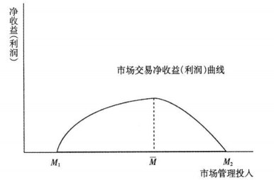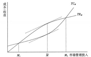市场交易所具有的这些特征, 可以用其成本和收益来刻画。当市场交易涉及中间投入品时, 这时市场交易方式所具有的非常重要的特点是单位中间产品成本固定或变化幅度较小。与跨国公司相关的成本, 除了中间产品的直接购买价格外, 还有谈判、签约和实施的成本, 即跨国公司这时也需要一定的管理投入, 注意这种管理投入与一体化带来的组织内部管理投入是不同的。当市场交易涉及到跨国公司产出的销售问题时, 与跨国公司相关的收益, 或者与批发价格相关(委托销售), 或者与零售价格相关(自行销售), 同样, 这时跨国公司也需要相应的管理投入(可以称为市场管理投入, 以示区别)。尽管这两类管理投入与组织内部管理投入在性质上存在较大的差异, 但可以用管理投入的价值量进行衡量, 这样就可以用同样的维度表达市场交易和垂直一体化下的管理投入。在图 4中, 表达的是跨国公司采取市场交易形式时的成本(TCM)和收益(TRM)曲线, 同理, 由市场交易方式的成本和收益关系也可以得出最优市场管理投入水平(M)以及市场交易的有效范围(M1, M2)。与垂直一体化情形下类似, 当面对不同的东道国或者东道国的环境特征随时间发生变化时, 跨国公司采取市场交易方式的成本和收益曲线的位置也会变化。