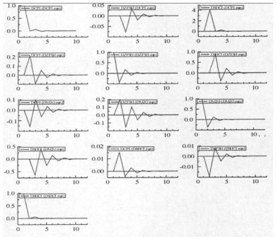 根据误差修正方程还可以进行冲击响应分析,假定对VAR模型中某一特定内生变量产生一个冲击,冲击发生在t=1时刻,大小为该变量在冲击发生之前样本均值的一个标准差,随后观察所有内生变量在冲击发生后一段时间内的响应和动态变化。