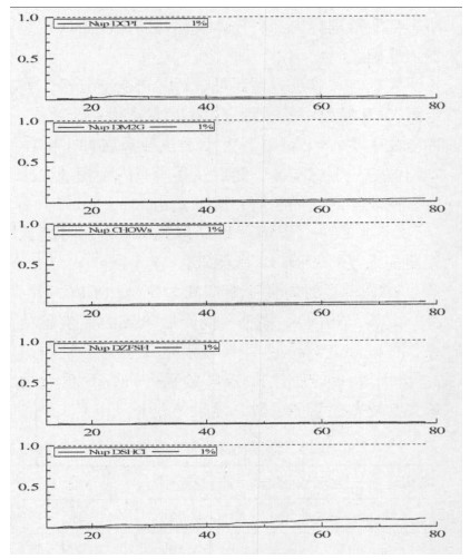 采用递归估计方法模拟上述结构性VAR,进行预期CHOW检验,结果如图 3所示(其中CHOW检验的p值设定为1%;前3幅图分别为3个内生变量的CHOW检验结果,最后1幅图是针对VAR模型的检验结果)。