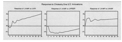 | $ \begin{array}{l} \ln IMP = 19.03 - 1085\ln REER - 3.08\ln WXP - 0.23\ln IPI\\ \;\;\;\;\;\;\;\;\;\;\;\;\;\;{\rm{(4}}{\rm{.01) (0}}{\rm{.51) }}\;\;\;\;\;\;\;\;{\rm{(0}}{\rm{.88) }}\;\;\;\;\;\;\;{\rm{(0}}{\rm{.251)}} \end{array} $ | (3) |