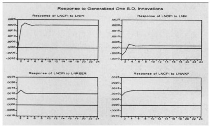 表 7显示,在CPI的波动中,大约有0—18.93%的波动可由工业增加值的波动解释,大约有0—0.096%的波动由实际有效汇率的波动解释,大约有0—1.835%的波动可由货币供应量的波动解释,大约有0—4.42%的波动由世界出口价格解释,其余部分可由CPI本身的波动解释。我们发现,货币供应量对CPI波动的解释程度高于实际有效汇率,工业增加值的波动对CPI波动的解释程度最高。从表 6和表 7可看出,外商出口成本波动对CPI的影响比对进口价格指数的影响小得多,这表明国外生产成本在汇率传递过程中对物价的影响逐渐减少。