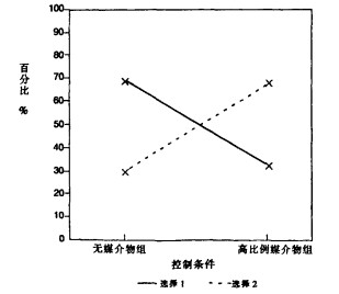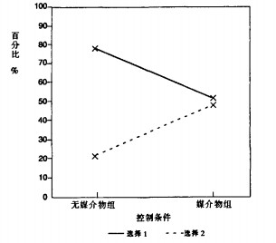 对比无媒介物条件与高比例媒介物条件两种情况,使用SPSS对该两组数据的四格表进行卡方检验。其结果如下所示:卡方值为19.707,P值等于0.000小于0.001。所以实验结果表明,无媒介物组和高比例媒介物组对两种选择的差异显著(见图 2)。