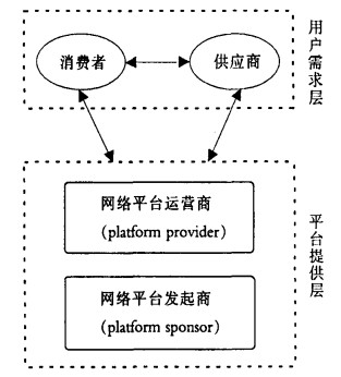 从组织结构上看,平台型网络产业的微观结构是由用户需求层和平台提供层构成,消费者和产品或服务供应商组成对网络平台产品或服务的用户需求层,网络平台提供层则由网络平台的运营商和发起商组成。在平台型网络微观结构的用户需求层中,除了消费者外,其余的参与者都是以供应商或投资商的形式存在,只不过他们供应的产品是各不相同的。和消费者达成交易或交互的是能够满足消费者最终需求的具体产品或服务供应商,这类产品或服务供应商在平台型网络产业中又被称为“部件供应商”。消费者和部件供应商有着明显的“交叉网络效应”,即一边用户的参与取决于平台另一边用户的数量规模,而另一边用户的参与也取决于该边用户参与平台的数量规模,也即一边用户的参与提高了另一边用户参与的动机或需求。