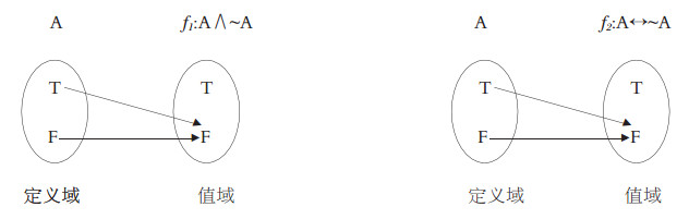 从这些定义不难看出,如果仅从语法方面的特征来讲,逻辑悖论可以分成两类:一类是在理论或系统中出现了A且~A(即A∧~A);另一类是出现了A↔~A。从逻辑联结词的涵义方面来讲,公式“A∧~A”和“A↔~A”确实揭示了不同的逻辑关系;但从真值联结词的角度来讲,两者表达的却是相同的真值函项。这可以简单地用映射关系图来表明——