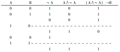 这也就是说,在经典逻辑系统当中,虽然这两个公式的真值形式不同,但两者表达的是相同的真值映射关系,因而这两个公式其实是相同的真值函项。既然如此,那么如果仅从语法方面考虑,在经典逻辑系统或者以经典逻辑为底层的理论中出现的悖论,就可以归结为出现了两者任意之一,即,我们可以将之归结为A∧~A。可以将逻辑悖论归结为在系统或理论中出现了A∧~A,是弗协调逻辑可以用来作为解悖方案的根源性原因。这是因为弗协调逻辑认为逻辑悖论是一种“真矛盾”①,而“真矛盾”是可以为弗协调逻辑系统所容纳的。这样,在弗协调逻辑可以把“真矛盾”作为对系统无害的因素来处理的机制下,逻辑悖论因之也在其中成为了对系统无害的因素。正是在这种意义上,逻辑悖论所导致的系统或理论本身无意义的结果被消解了,而弗协调逻辑因此就可以作为一种解悖方案。而若要理解这种消解悖论思路,就需要首先明确弗协调逻辑无害化处理“真矛盾”的逻辑机制。