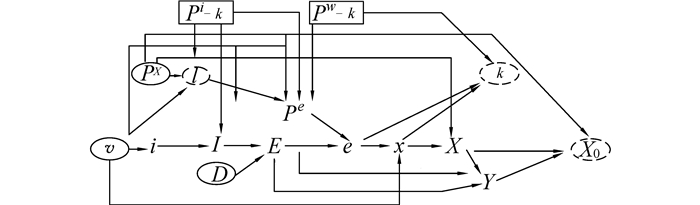 图 1中实心圆圈字母表示已知数政策目标:充分就业(υ)、货币均衡(PX)和国际收支平衡(D);虚线圆圈字母表示未知数即三个政策工具:政府支出(X0)、工资率(l)和汇率(k);方框为资料,其他字母属于无关变量,在推导过程中将逐渐消去。图 1下方的推导方程序号,是指与图 1中作为推导出中间未知数变量以及最终未知数变量相对应的方程序号。