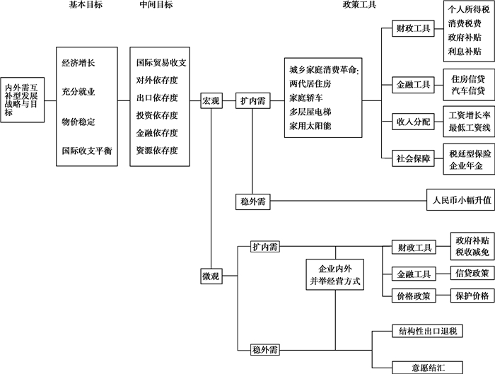 (二) 内外需互补型发展战略的经济政策体系——丁伯根基础模型的扩展内外需互补型发展战略作为中国宏观经济的发展取向,在实施过程中还要求对上述基础性政策模型进行丰富和扩展,构建更为具体和综合性的经济政策体系。如图 2所示,该体系由基本目标进一步扩展到中间目标,并形成更大的政策工具体系。图 2中,政策工具扩展为两大部分——宏观和微观两方面,每一方面又可分为扩内需政策和稳外需政策。