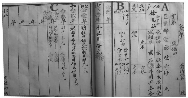 图 1为民国时期吴县周礼和租栈的收租记录,为便于说明,笔者将该图划分为A、B、C三部分:图中右边A部分是用大写数目汉字记载着田地所在的都图圩的位置、佃户的姓名及其承种田地的亩数和应交的租额;图中B部分即写着“坵”字的一栏相当于备注,是对前面内容的补充说明,记载着佃户所种“坵”(即地块)数及每“坵”的面积,“坵”字之下的“符号”即是表示每“坵”面积的“花数”。该页佃户徐龙福租种二亩三分二厘田,分作两“坵”,一“坵”为一亩四分二厘八毫,另一“坵”为九分。民国36年该田“拆田”(即田地分割),归徐曾金和徐金水二人分种,二人姓名之下的那些符号也是“花数”,其内容是每人各自耕种“一亩一分一厘四毫”,租额均为“一石零四升二合”。图中C部分则是民国19年到29年所收租款的详细记录,该部分页眉上的三个数字符号