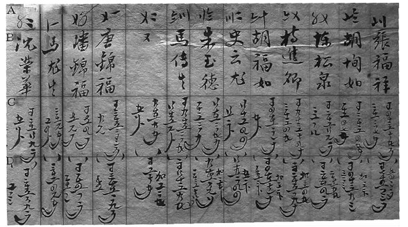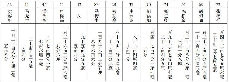 图 2中A行是催甲的编号,使用的是苏码,B行是催甲姓名,C和D行是用“花数”记录的田地亩数。现将C行的“花数”对应“翻译”如表 1,D行的“花数”留待感兴趣的读者自己认读。