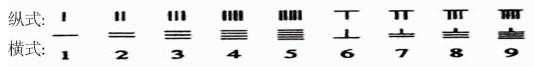 上述学者的考证认为,苏码脱胎于算筹。算筹是中国古代的计算工具,它的起源大约可上溯到公元前5世纪,后来写在纸上便成为算筹记数法。根据史书的记载和考古材料的发现,古代的算筹实际上是一根根同样长短和粗细的小棍子,一般长为13—14cm, 直径约0.2—0.3cm,其材料多用竹子制成,也有用木头、兽骨、象牙、金属等材料制成。用算筹来表示数字符号时,有纵横两种排列方式: