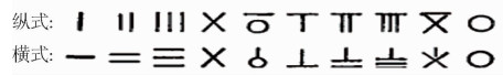 至迟到春秋战国时代,又开始出现严格的十进位制筹算记数并总结了筹算的记数规则。公元3—4世纪成书的《孙子算经》记载说:“凡算之法,先识其位。一纵十横,百立千僵。千十相望,万百相当。”算筹的纵横相间排列,目的是以免数字混淆错乱。算筹表示数字后也在不断地演变。南宋大数学家秦九绍对这套使用了一千多年的数学符号进行了大胆的改革,创造了一套专用的记数符号,后人称为南宋数码,如下所示: