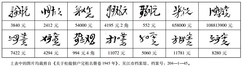 以往介绍苏码的文章大多用的是“正楷字”。实际上,这些码子是用毛笔手写的“草体”,“草码”的称呼即由此而来,而草体的书写具有很大的随意性和不规范性,笔画的粗细长短、字体的肥瘠大小相差悬殊,字与字之间排列布局疏密不一,颇有汉字书法艺术上所谓“疏能跑马密不透风”之特征。和苏码一样,其他“花数”均带有很强的个性化色彩,每人书写习惯、书写风格、文化素养各不相同,其字体呈现出千姿百态、丰富多彩的特色。加之“草码”与小写数字的混用以及“数”与“字”之间的连笔书写,大大增加了辨认的难度。为了便于释读,本文的“花数”是用ACDSee Pro Photo软件裁剪自租册上的“原始”字体,这些租册来自于苏州、吴江、常熟、松江、青浦、嘉定等地档案馆,对于这些零星的、单独的数与字的出处,不再逐一注明。