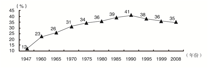 图 1 1947年以来荷兰社会住房占全国住房总量比重的变化趋势 数据来源:根据Van Kempen和Priemus(2002),Priemus(2009)的研究整理。 |