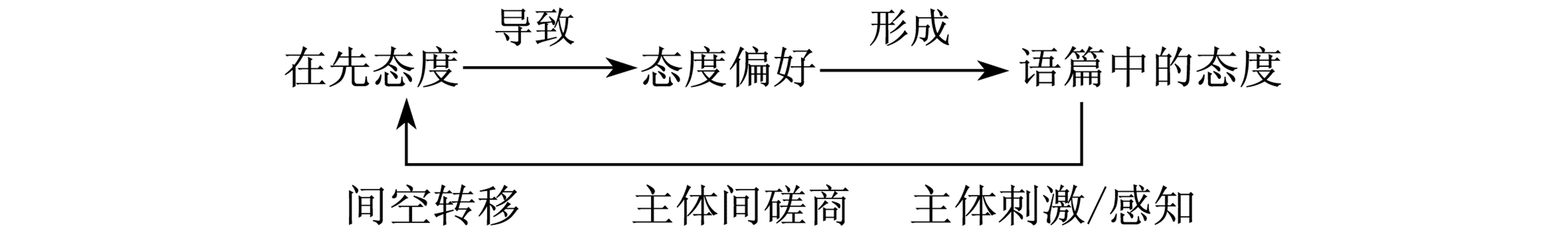 通过分析,我们发现从在先态度到语篇中的态度是一个循环的过程。这个循环的起点是特定时间点上特定事件的发生引发了特定语篇中某个语言现象产生特殊的态度意义,这种特殊的态度意义刺激了感知主体的大脑或内心,形成特定的感受。随着时间或时空的推移或转移,这种特定的态度意义经过主体间的磋商被固定下来,进而形成了在先态度。当在先态度在个体中形成特定的心理感受之后,根据自己的态度偏好在语境中选取相应的语言资源来构成语篇中的态度。这个过程周而复始,构成了在先态度的形成机理。如下图所示:
