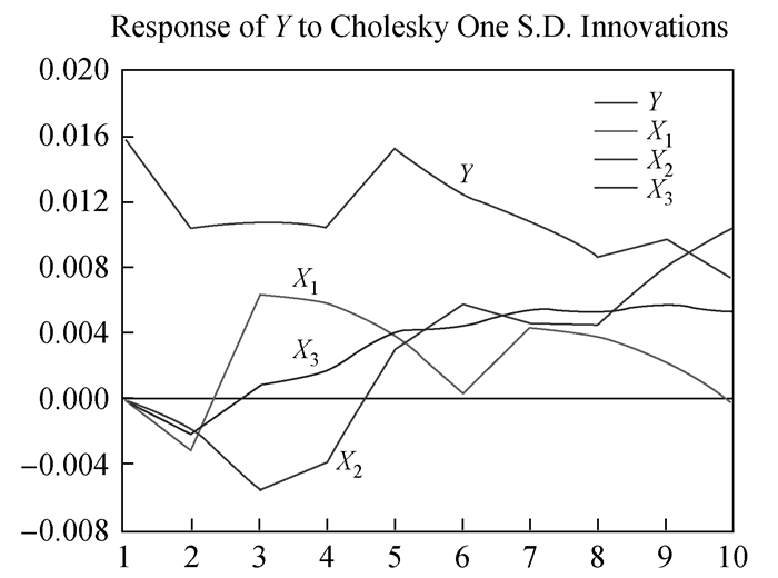 6.基于VAR模型的方差分解。脉冲响应函数描述的是VAR模型中的一个内生变量的冲击给其他内生变量带来的影响。而方差分解是通过分析每一个结构冲击对内生变量变化的贡献度,进一步评价不同结构冲击的重要性,因此,方差分解给出对VAR模型中的变量产生影响的每个随机扰动的相对重要性的信息。在VAR模型的基础上进行方差分解,有助于我们研究模型的动态特征。模型方差分解结果如表 3。由输出结果可见,在第一期,X1、X2和X3对预测误差的贡献度都为零,Y对其自身的解释度达到100%;随着时间的推移,X1、X2和X3对预测误差的贡献度逐渐提高,到达第八期之后,方差分解结果基本稳定。X1、X2和X3对预测误差的贡献度分别为8.6%、8.6%和6.6%,三者的总和为24%左右,这表明自变量对于因变量预测误差的贡献度为24%,说明意大利债务危机发生初期,债务本身的积累对危机的发生起着关键性作用,随着危机进一步深化,意大利经济中的结构性问题突出,其代表的变量的解释力提高,但是债务危机的成因中仍有76%部分无法被解释。