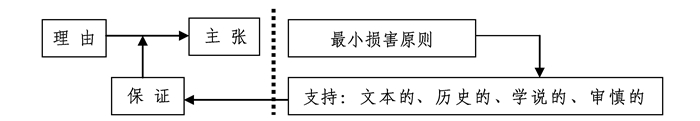 具体而言,在帕特森看来,在法律实践中,人们使用四种论证形式(文本的、学说的、历史的和审慎的)来显示法律命题的真,当不同论证形式发生冲突的时候,人们实际上也应当根据蒯因的最小损害原则去选择那些已被接受的法律真理冲突最小的结论。这个论证结构可以用图表示如下:⑧