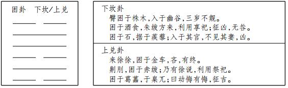 第一,卦画解读方式显示的易象特征的丰富和多样打开一种完全不同于通行本的文本含义并展示出一个不同的远古意象和异样色彩的世界。这里可以通过困卦爻辞语篇解读来具体说明易象的特征和对于困卦爻辞语篇不同于通行本的理解: