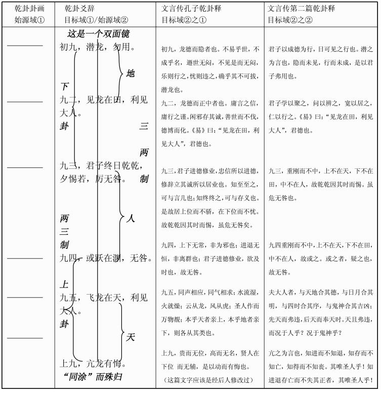 乾卦卦画作为始源域和乾卦爻辞语篇作为目标域构成了第一个认知隐喻结构配对。孔子只强调有文字的半边,不理会卦画,就文字部分加以发挥,形成了新的目标域,形成了第二个认知隐喻结构的配对,自然就是“殊归”了。孔子所说的“同涂”则是貌似,其实存在差异。如果说卦画和爻辞语篇这个隐喻结构合起来是一条路,已经分成左右两边,孔子所倚重行走的是路的右边,而史巫所倚重行走的是路的左边。因此,从上表可以看出,《文言传》中的孔子乾卦爻辞语篇和第二个乾卦爻辞语篇是以乾卦爻辞语篇作为始源域而产生的两个目标域。