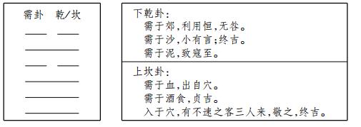 1) 一个六画卦分为两个三画卦的特征是显著的,这在通行的注本中有许多是没有说明的,这里举两个例子需卦和鼎卦来说明。需卦中的下卦为乾卦,上卦为坎卦,爻辞语篇为: