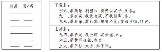 鼎卦显明下巽卦和上离卦分别为两个不同的鼎象,这最能够证明原卦的结构是按照自然的两个三画卦衔接而成的爻辞语篇。比较两个鼎可以看出:下巽卦之鼎没有上离卦之鼎高级,因为下鼎言趾,上鼎称足;下鼎言耳,上鼎则是黄耳、金铉。两个鼎中的食物也不相同,一个是有实,有雉膏;一个是公之餗,同样有等级上的差异。正因为如此,有诸多易象上的差别。