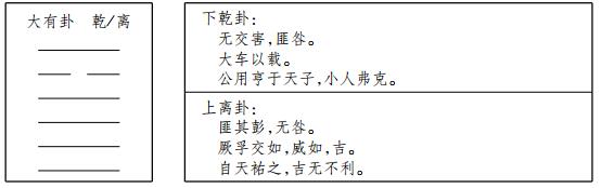 这里的统计只是表明卦画的名称是否出现在每一条爻辞中情况,卦名没有出现在爻辞中,有可能会有同义词、近义词或其他的表达方式仍然起着连贯和衔接的作用,前面我们看到坤卦爻辞中没有出现坤,但是每一爻中都不缺乏坤的信息,是一种隐性的连贯和衔接。这里我们以大有卦为例:
