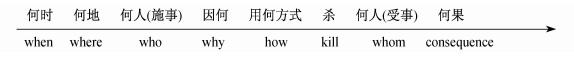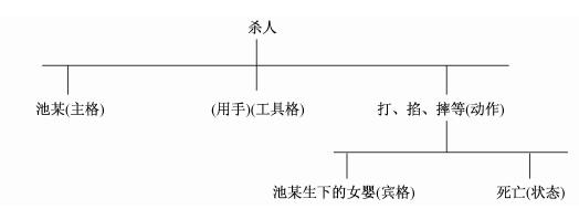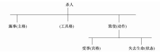《现代汉语大词典》对“杀”释为“使人或动物失去生命;弄死”,并未限定通过什么手段致人死亡,而只是说明结果。根据Alder和Doren提供的乘车图式,我们用格语法的形式把“杀人”的原型描述为: