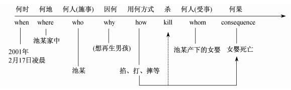 我们认为,庭审叙事是对过去发生过的事件的叙述,因此属于叙述式语篇,叙述式语篇的图式要素是时间、地点、人物、事件、方式等,其结构是以事件的起因、发展和结果为脉络的。因此在庭审叙事的内容上我们采用故事图式(描写原型故事及其变异的图式。“它识别构成故事的单元、这些单元的顺序、以及特别容易出现在单元之间的各种连接”),在形式上我们采用形式图式(涉及与语言应用形式有关的知识)。下面我们将以“故意杀人”为例来说明庭审叙事中的故事图式构建。
