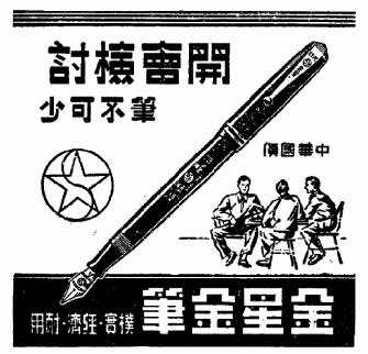 广告上是一群中上层阶层模样的人,穿着制服,正在进行小组讨论,大概是在作“自我批评”。上面写着广告词:“中华国货”、“开会检讨”、“笔不可少”、“朴实、经济、耐用”,类似这样的广告在解放后的几年里,经常能在党报和主要报纸、杂志上看到。当你看到这样的广告大量出现在一个新的社会主义国家时,心里有没有产生过疑问?