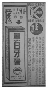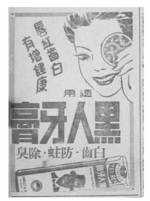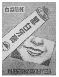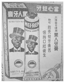 右边这个广告刊登于1951年5月5日上海的《大公报》上。④注意,在产品的包装上还在使用代表外国产品的英文印刷体,包括非常具有外国化的香港公司的名字,这家公司的牙膏品牌以“Darkie”享誉东亚和东南亚,在中国则以“heiren”闻名。