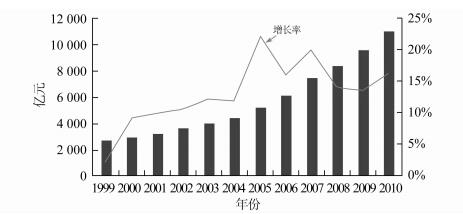 图 1表明,2004年之前服装业销售额增速较为缓慢,1999年至2004年全国服装总体国内销售额从2 694亿元增长至4 400亿无,年复合增长率为10.3%;2004年至今进入快速增长阶段,其中2004年至2010年年销售额从4 400亿元增长至11 019亿元,年复合增长率为16.5%。②这是因为,服装具有必需消费品与可选消费品的双重特性,在2004年之前,也就是在城镇居民人均可支配收入达到10 000元之前,服装更多地显示了其必需消费品的特性,因此服装消费的收入弹性系数较低。在居民可支配收入达到10 000元之后,服装更多地表现出可选消费品的特性,消费者对服装的需求目的体现为追求时尚、表达个性和身份识别等,服装消费的收入弹性系数提高。