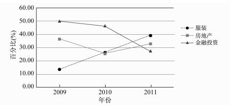 图 2显示,2009—2011年,尤其是2009—2010年,雅戈尔金融投资(主要是股权投资)和房地产开发的净利润占公司全部净利润的半壁江山甚至大半壁江山。为缓慢,1999年金融投资和房地产开发的净利润占比分别为49.80%和36.50%,均分别远高于服装业的13.63%。雅戈尔2009年以前的年报中没有提供三项业务的净利润数据,但提到过2008年房地产开发的净利润比上一年增长181.86%,服装业的净利润比上一年仅增长28.14%。从2009年的净利润结构似可推断,之前的几年,金融投资和房地产开发的净利润占比之和应该也是远高于服装业的。2010年由于政府对房地产市场实行调控,导致雅戈尔房地产开发的净利润占比有所下降,但2011年又有所上升。