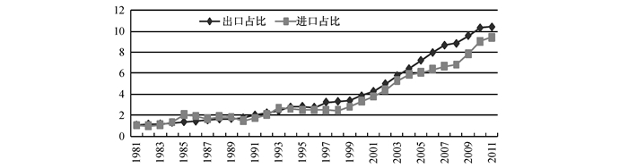 图 1 中国在世界进出口贸易中所占比例的变化(单位:%) 数据来源:UNCTAD。 |