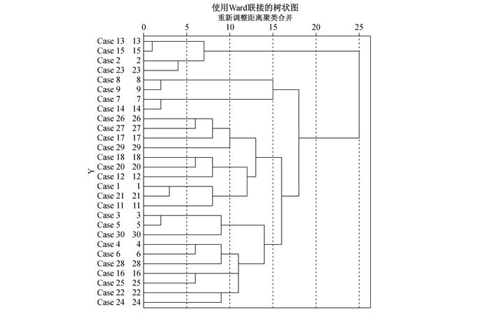 表 3中,对角线上的数据均为1,表示某词自身的相关程度;矩阵中的数字大小表明了相应的两个关键词之间的距离远近。其数值越接近1,表明关键词之间的距离越近,相似度越大;其数值越接近0,则表明关键词之间的距离越远,相似度越小。由于上述矩阵中的0值过多,统计时容易造成误差,为方便进一步处理,用1与全部矩阵数据相减,得到表示两词间相异程度的相异矩阵(见表 4),作为后面聚类分析和多维尺度分析的矩阵变量。如表 4所示,相异矩阵中数据的数值越大,表明关键词之间的距离越远,相似度越差;其数值越小,表明关键词之间的距离越近,相似度越大。