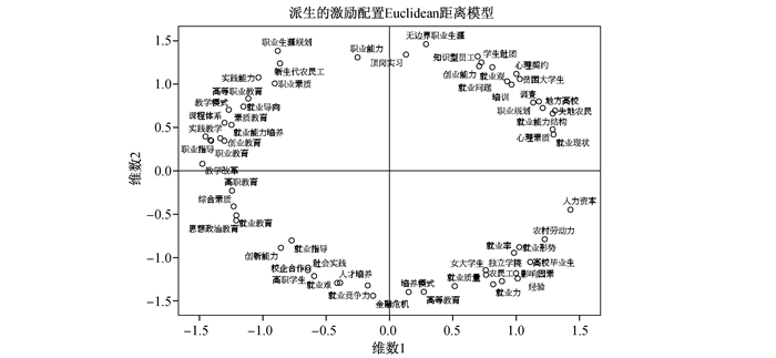 3.多维尺度分析。虽然从聚类分析中可以看到就业能力研究的热点,但依然无法明确各个研究热点在就业能力研究中所处的位置,因此,我们还需要通过多维尺度来进一步分析。多维尺度分析是通过测定事物或观测量之间的距离来发现数据结构,其原理是通过指定观测量到概念空间的一个特定位置,得到空间中距离的相似性(安源,2012)。该方法比较直观,且可作为聚类分析、因子分析的辅助技术。多维尺度分析结果中,被分析的对象以点状分布,每个点的位置显示了分析对象之间的相似性;有高度相似性的对象聚集在一起,形成一个类别(安源,2012)。趋近于中心点的位置且分布较为集中的关键词代表受到较高关注的方向,越在边缘的说明其研究主题越狭小,或正过渡到其他主题。