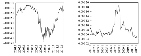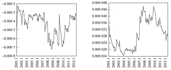 图 2 市场对数收益率与人均消费增长率g(左)、货币流动性变动率m1(右)之间的协方差 |