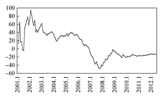 表 1和图 4的估计结果均提示,中国投资者的相对风险厌恶系数在整个分析时段内几乎都超出Mehra和Prescott(1985)认可的γ∈(0,10)合理区间范围。与此同时,由于中国A股市场对数收益率与个体消费增长率之间呈现出与理论不相符合的负相关关系,从2006年12月起相对风险厌恶系数γ变为负数。