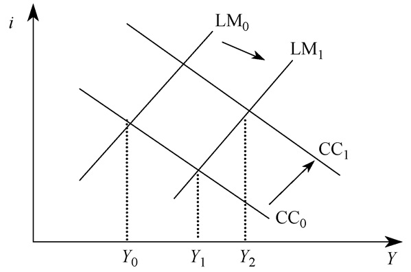 如图 4所示,不考虑货币国际化条件下的信用渠道的传导机制如下:扩张性货币政策(R增加)使LM曲线右移,引起国民收入从Y0增加到Y1, 市场利率i下降;同时R增加必会引起信贷扩张,从而贷款利率iL下降,投资I扩张,CC曲线右移,又引起国民收入进一步增加到Y2。众所周知,如果只考虑利率渠道,则与CC曲线位置相对应的IS曲线在货币扩张条件下不移动,显然与纯粹的利率传导渠道相比,信用渠道传导的产出效应增强。由式(1)(17)(19)解得: