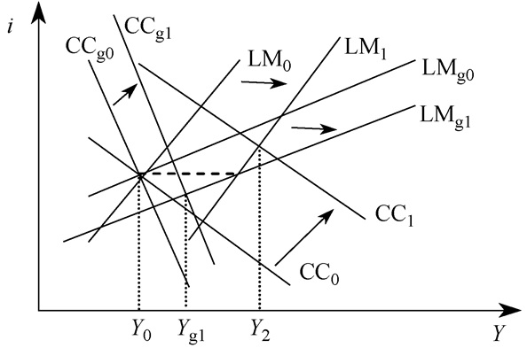 图 1、图 2中,我们是以扩张性货币政策为例来分析的。图中带下标g的IS、LM和Y分别表示货币国际化发展后的IS曲线、LM曲线和国民收入。为便于比较,我们假设原IS与LM的交点的初始位置与加入货币国际化后的IS、LM交点的初始位置重合。所以图中Y0既表示无货币国际化条件下产品与货币市场初始双重均衡时的国民收入,又表示考虑了货币国际化后的产品与货币市场初始双重均衡时的国民收入,Y1表示无货币国际化条件下实行扩张性货币政策后产品与货币市场双重均衡时的国民收入。下面进行具体分析。由式(6)(7)得: