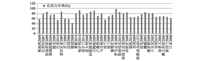 图 2 世界主要发达国家住房自有率 资料来源:欧洲国家及美国住房自有率数据引自European Mortgage Federation(2011:72);加拿大、澳大利亚、新西兰、日本的住房自有率数据来自各国国家统计局。 |