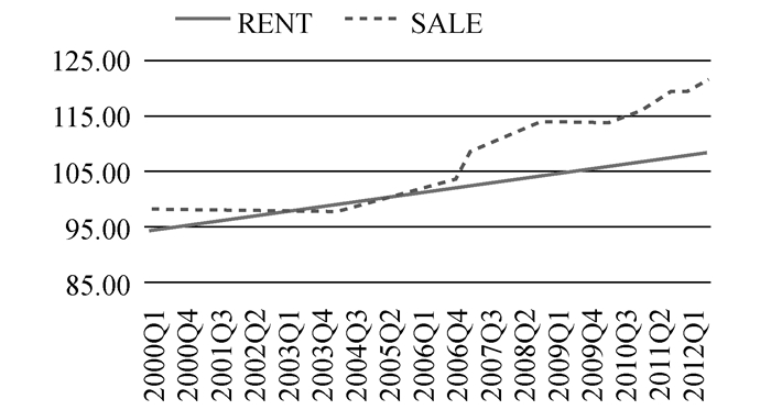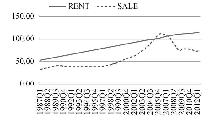 我国学者周京奎(2005)对1999年至2004年我国房屋销售价格和租赁价格的季度数据进行了协整检验,发现两者不具有协整性。刘仁、程昆和莫金玲(2011)对北京、上海、广州和深圳四城市1993年至2010年的住房价格指数与租金指数进行了协整检验,结果也表明两者之间不存在协整关系。这两项研究揭示了我国住房市场价格与租金的关系偏离了长期均衡的理论关系这一事实,证明了我国住房市场上租买选择机制的缺失。崔裴和严乐乐(2010)认为,我国住房市场上租买选择机制缺失的主要原因是由于住房租赁市场存在缺陷。