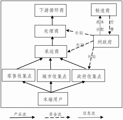 然而,目前我国的WEEE处理的补贴配给机制仅仅补贴纳入废弃电器电子产品处理基金补贴范围的拆解企业,没有规定在收集商、运输商、处理商和循环商之间的基金补贴分配方式,也未确定在回收主体联合商业网点等合作联盟中如何进行基金补贴分配。因此,存在多个再生资源加工园区的处理企业“吃不饱”的现象,而大量流动商贩收集到的废弃产品由于缺少国家补贴而不能进入处理企业进行拆解处理(姚婷婷、陈泽勇、李翔,2011)。基于合作博弈工具,设计合理的补贴分配机制,进一步改进合作网络联盟的公平性,并进一步提高整体效率,这一机制在美国华盛顿州的WEEE制造商责任延伸制度构建实践中得到了验证和支持(Gui,L.,et al,2012),也是值得我国参考和借鉴的。