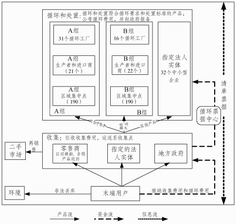 循环票据记录了WEEE从收集点经过区域集中点到达循环工厂的全过程信息。循环票据通常有五联,末端用户消费者会持有最原始联,零售商持有第二联;另外三联与产品一并到达区域集中点,第三联将保留在区域集中点,另外两联与产品一起送达循环工厂;循环工厂持有第四联,并将第五联返还给零售商,完成一个闭环过程。零售商收到第五联后将资金转移给制造商。循环票据的每联都记录编号、产品型号、制造商名称等产品详情以及回收此废旧产品的零售商详情。末端用户通过票据就能直接获得返回WEEE产品的现状和处理状况等信息,而制造商也可以追踪返回产品的缴费情况和循环再利用的时间地点等信息。零售商会缴纳一部分资金,通常用于支付收集和运输费用。此部分资金是根据零售商的规模或者根据末端用户在丢弃时是否以旧换新而定。