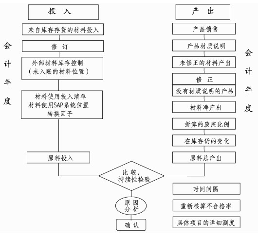 三 信息系统的一致性检验企业在最初回溯环境事项的时候,往往首先关注物料流动平衡。通过物料流动平衡表进行投入产出分析,将成为企业提高环境绩效、评估非生产性产出的数量与成本的基础。而物料流动分析通常由技术人员负责,因此,对其所收集的数据应当反向复核,以确保与成本会计系统保持一致。由于技术上的数据和财务账簿记录的数据常常无法协调一致,因此,两者核对的一致性将带来极大的最优化效应,并成为环境会计能够利用的主要工具。可见,技术上的处理与财务上的记账相互兼容,是最为理想的操作方式。