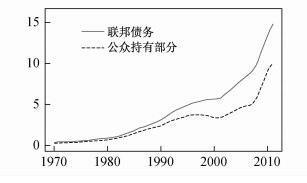 图 1 联邦债务及公众持有部分绝对额 注:数据来源于President Economic Report, 2012, 1970—2011;图 1中的单位为万亿美元。 |