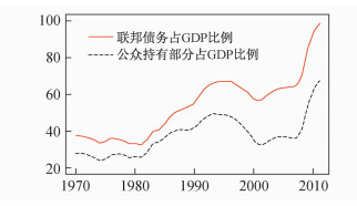 截至2011年12月, 联邦债务总额为15.22万亿美元, 公众持有部分为10.45万亿美元。图 1和图 2给出了1970—2011年的联邦债务及其构成变化情况。从绝对数额上看, 两种债务的数额都在增加, 尤其是在20世纪80年代后, 增速都在加快。从占GDP的比例上看, 70年代以来两者总体上都呈上升趋势, 特别是此次经济危机期间, 联邦债务总额占GDP的比例已接近100%, 公众持有部分占GDP的比例也超过60%。